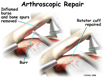 There are many small instruments that have been specially designed to perform surgery in the joint. Some of these instruments are used to remove torn and degenerative tissue. Some of these instruments nibble away bits of tissue and then vacuum them up from out of the joint. Others are designed to burr away bone tissue and vacuum it out of the joint. These instruments are used to remove any bone spurs that are rubbing on the tendons of the shoulder and smooth the under surface of the acromion and AC joint.